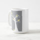 Five adorable abstract yellow birds hang out in a white tree against a grey background on a mug