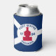 Can cooler with flag of city of Fort Wayne, Indiana; blue and white flag and with red blockhouse in the center and three illustrations in the blue field - illustration of Native American’s head, French fleur-de-lys and British lion