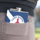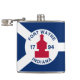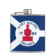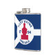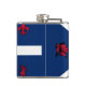 Vinyl wrapped flask with flag of city of Fort Wayne, Indiana; blue and white flag and with red blockhouse in the centre and three illustrations in the blue field - illustration of Native American’s head, French fleur-de-lys and British lion