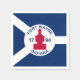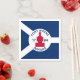 Paper napkin with flag of city of Fort Wayne, Indiana; blue and white flag and with red blockhouse in the center and three illustrations in the blue field - illustration of Native American’s head, French fleur-de-lys and British lion