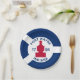 Paper Plate with flag of city of Fort Wayne, Indiana; blue and white flag and with red blockhouse in the centre and three illustrations in the blue field - illustration of Native American’s head, French fleur-de-lys and British lion