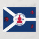 Postcard with flag of city of Fort Wayne, Indiana; blue and white flag and with red blockhouse in the center and three illustrations in the blue field - illustration of Native American’s head, French fleur-de-lys and British lion