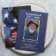 Blue funeral memorial prayer card with your favourite photo in frame. Modern typography is used. On the back of the card is additional text that can be customised overlaying USA flag.