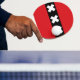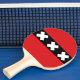 Ping pong paddle with design with flag of Amsterdam, capital city of Netherlands, red and black flag with three white Saint Andrew’s crosses in the centre