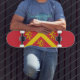 Skateboard with design with a flag of historic county of Anglesey, in Wales, Great Britain;; red flag with yellow chevron and three lions;