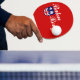 Ping pong paddle with flag of city of Baton Rouge, Louisiana; red flag with seal with Union Jack