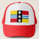 Hat with design with a flag of historic county of Bedfordshire, in England, Great Britain; red and gold flag with black vertical band with tree white scallops in the centre