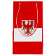 Paper bag with flag of Brandenburg (Brandenburgs), design with two bands of red and white with state’s coat of arms with an illustration of a red eagle in the centre