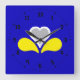 Clock with design with flag of Brussels-Capital Region of Belgium, blue flag with yellow, grey and white iris