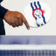 Ping pong paddle with flag of city of Cincinnati, Ohio; white flag with three blue waves with red “C” in the centre