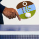 Ping pong paddle with flag of Fresno, California; flag with three vertical bands of brown, blue and green, with stylised illustrations of cog, plant and sun