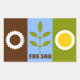 Sticker with flag of Fresno, California; flag with three vertical bands of brown, blue and green, with stylised illustrations of cog, plant and sun