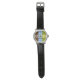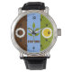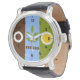 Watch with flag of Fresno, California; flag with three vertical bands of brown, blue and green, with stylised illustrations of cog, plant and sun