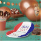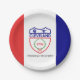 Paper Plate with flag of city of Cleveland, Ohio; flag with three vertical bands of red, white and blue with seal of the city in the centre