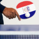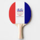 Ping pong paddle with flag of city of Cleveland, Ohio; flag with three vertical bands of red, white and blue with seal of the city in the centre