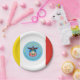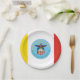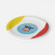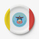 Paper plate with flag of city of Columbus, Ohio; flag with three vertical bands of yellow, white and red with blue seal of the city with bald eagle in the centre