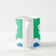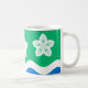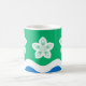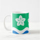 Mug with design with a flag of historic county of Cumberland, in England, Great Britain; green flag with three Parnassus flowers and white and blue waves