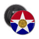 Button bottle opener with flag of city of Dallas, Texas; flag with red and blue horizontal bands with seal of the city inside of a white star in the centre