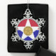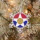 Snowflake Ornament with flag of city of Dallas, Texas; flag with red and blue horizontal bands with seal of the city inside of a white star in the centre