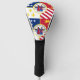 Golf driver cover with flag of city of Detroit, Michigan; red, white and blue flag with stars and stripes, fleur-de-lys, dragons and seal of the city
