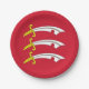 Paper plate with design with a flag of historic county of Essex, in England, Great Britain; red flag with three white, gold hilted Saxon swords (Seaxes)