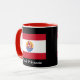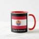 The flag of French Polynesia was adopted in 1984. Two red horizontal bands encase a wide white band in a 1:2:1 ratio; centred on the white band is a disc with a blue and white wave pattern depicting the sea on the lower half and a gold and white ray pattern depicting the sun on the upper half; a Polynesian canoe rides on the wave pattern; the canoe has a crew of five represented by five stars that symbolise the five island groups; red and white are traditional Polynesian colours.