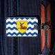 Luggage Tag with design with a flag of historic county of Hertfordshire, in England, Great Britain; flag with an illustration of a stag in a yellow shield on white and blue wavy background