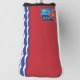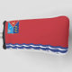 Golf putter cover with flag Magadan oblast (Magadanskaya oblast); red flag with alternating blue and white waves with coat of arms in the upper left corner