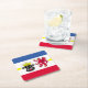 Paper coaster with variant flag of Mecklenburg-Western Pomerania; design with five horizontal stripes of red, white, blue and yellow, and with illustrations of bull’s head and red eagle