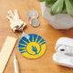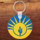 Button Keychain with flag of city Mesa, Arizona; yellow and blue flag with stylised illustrations of desert, cactus and rising sun
