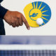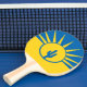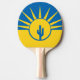 Ping pong paddle with flag of city Mesa, Arizona; yellow and blue flag with stylised illustrations of desert, cactus and rising sun