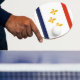 Ping pong paddle with flag of city of New Orleans, Louisiana; white flag with red and blue stripes and three golden fleur-de-lys