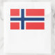 The flag of Norway is red with an indigo blue Scandinavian cross outlined in white that extends to the edges of the flag; the vertical part of the cross is shifted to the hoist side in the style of the Dannebrog, the flag of Denmark.
