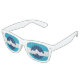 Sunglasses with a design with the flag of Ogden, Utah. A blue and white flag with mountain peaks in the centre