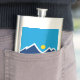 Flask with a design with the flag of Orem, Utah. A blue, white, and yellow flag with mountain peaks and the sun in the centre