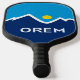 Pickleball Paddle with a design with the flag of Orem, Utah. A blue, white, and yellow flag with mountain peaks and the sun in the centre