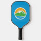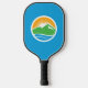 Pickleball Paddle with a design with the flag of Provo, Utah. A blue flag with the Provo City logo in the centre. The logo represents the Utah lake and nearby mountain peaks with the rising sun in the background