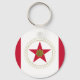 Button Keychain with flag of city of Raleigh, North Carolina; flag with three vertical bands of red and white with city’s seal in the centre