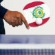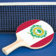 Ping pong paddle with flag of city of Raleigh, North Carolina; flag with three vertical bands of red and white with city’s seal in the centre