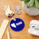 Button Keychain with flag of city of Reno, Nevada; blue flag with white shape of Nevada with star symbolising Reno’s location inside the state