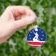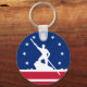 Button Keychain with flag of city of Richmond, Virginia; blue flag with red and white stripes, with white stripes and silhouette of man working James river bateau down the James river
