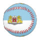 Baseball with design with flag of Riga, capital city of Latvia; white and blue flag with coats of arms with two golden lions holding a shield in the centre