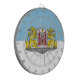 Dartboard with design with flag of Riga, capital city of Latvia; white and blue flag with coats of arms with two golden lions holding a shield in the centre