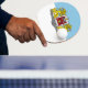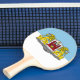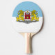 Ping pong paddle with design with flag of Riga, capital city of Latvia; white and blue flag with coats of arms with two golden lions holding a shield in the centre