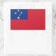 The flag of Samoa was adopted on February 24, 1949. It consists of a red field with a blue rectangle in the canton. The blue rectangle bears the Southern Cross Constellation: four large white stars and one smaller star.