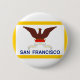 Round Button with flag of city of San Francisco, California; white flag with yellow border with an illustration of a phoenix rising from flames