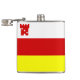 Vinyl wrapped flask with flag of city of Santa Barbara, California; flag with vertical tricolor of white, red and yellow, with illustration of a red fort in the upper left corner