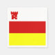 Paper napkin with flag of city of Santa Barbara, California; flag with vertical tricolor of white, red and yellow, with illustration of a red fort in the upper left corner