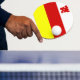 Ping pong paddle with flag of city of Santa Barbara, California; flag with vertical tricolor of white, red and yellow, with illustration of a red fort in the upper left corner