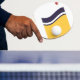 Ping Pong Paddle with a design with the flag of South Bend, Indiana. A white, blue, and yellow flag with a red star